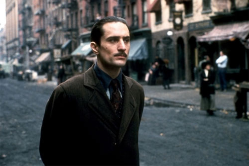 Robert De Niro izvrsno interpretira ulogu mladog Corleonea. Već tada u mlađim danima vidimo obrise Kuma kojeg smo upoznali u prvom filmu – usluge i poštovanje lokalne zajednice i suradnika karte su na koje Vito igra. Nasilje će upotrijebiti kada drugog načina nema – u trenucima zaštite obitelji ili kada je potrebno ukloniti konkurenciju. Mladi Vito poštuje, ali milosti nema – Don Fanucci je jedna od prvih žrtava Corleonovog puta na vrh mafijaške hobotnice. No, Fanucci je postao bivši i zbog odnosa prema sunarodnjacima….